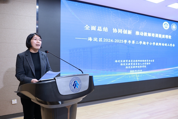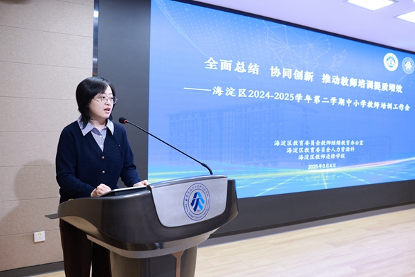 海淀区教师进修学校师训部主任张晓以“全面总结 协同创新 推动教师培训提质增效”为题做新学期教师培训工作部署。新学期,全区教师培训工作要大力弘扬践行教育家精神,坚持师德为先、教师为本,遵循规律、标准先行,数字赋能、精准培训,对标“十四五”规划,以教师学习为中心,深化教师培训课程建设,创新教师培训模式,三位一体提升教师思想政治素养、师德修养和教书育人能力,形成高质量培训成果和海淀师训品牌,做好“十四五”教师培训工作总结和成果固化、辐射推广,为科学制定“十五五”规划奠定坚实基础。