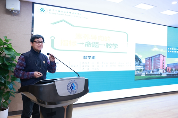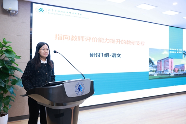 语文教研室郝婧坤老师代表第一组围绕“指向教师评价能力提升的教研支撑”主题做汇报。组内老师关注不同层次教师评价能力发展的需求,构建课堂学习评价设计与实施标准、升级学业质量评价指标体系、开发作业设计模板,在此基础上,深化落实指向教师评价能力提升的“5+M+N”教研课程。