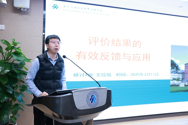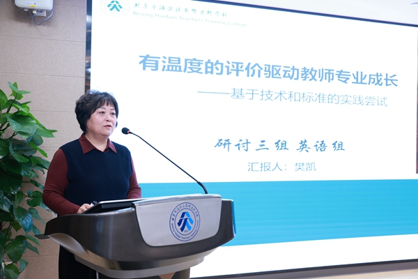 师训部樊凯老师代表第三组做汇报。组内聚焦“有温度的评价驱动教师专业成长”主题,从“基于技术的课堂评价”和“基于标准的教师评价”两个方面展开深度研讨,结合实践案例提炼人机协同综合诊断的流程和方法,以及基于标准的教师基本功提升的路径和策略。