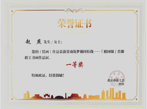 3月27日,书画俱乐部隆重举行了颁奖仪式。在海淀区教育工会、进修学校工会的组织和推荐下,赵燕老师的水彩画作品《一带一路·远望》荣获北京市总工会主办的2024年“劳动筑梦 强国有我”——首都职工书画作品展一等奖。海淀区教育工会副主席赵巍,进修学校工会主席皮国萃为赵燕老师颁发了荣誉证书。赵老师带领大家现场赏析了获奖作品,深刻的内涵、绚丽的色彩、细腻的笔触,让大家跟随画作,共同憧憬美好的生活。