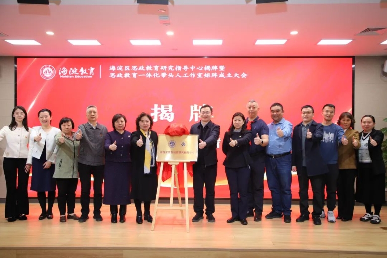北京市学校思政中心主任薛健、区教工委副书记吴谨、北京市学校德育研究会常务副会长尹丽君和海淀区教师进修学校校长姚守梅共同为“海淀区思政教育研究指导中心”揭牌。思政中心全体干部教师与揭牌领导合影留念。