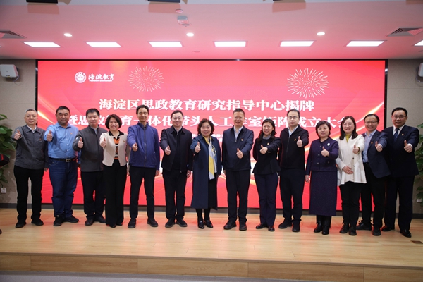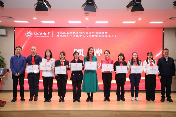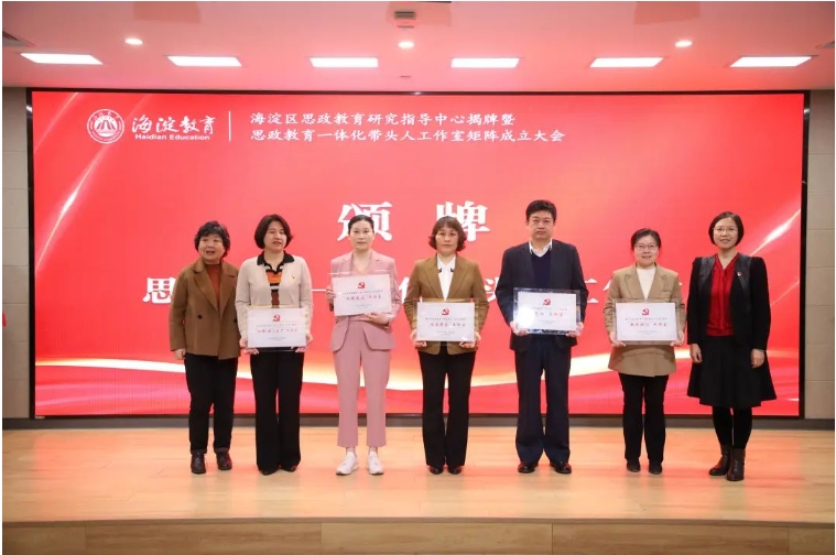 海淀区教科院吴颖惠院长、海淀区教师进修学校申军红书记为思政教育一体化带头人工作室颁牌;海淀团区委任一丁书记、教育党校赵欣校长为团委书记带头人工作室颁牌;北京市少先队总辅导员郑雄、北京教科院德育研究中心谢春风主任为少先队辅导员工作室颁牌。