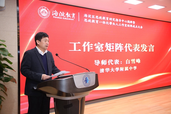 清华大学附属中学白雪峰副校长作为牵头导师代表发言。白校长认为“思政教育一体化带头人工作室”的成立标志着海淀区大中小学思政教育一体化建设步入常态化与内涵式发展的崭新阶段,充分彰显了海淀区教育领导者与教育工作者的长远视野、宏大格局、精细谋划和深厚情怀。